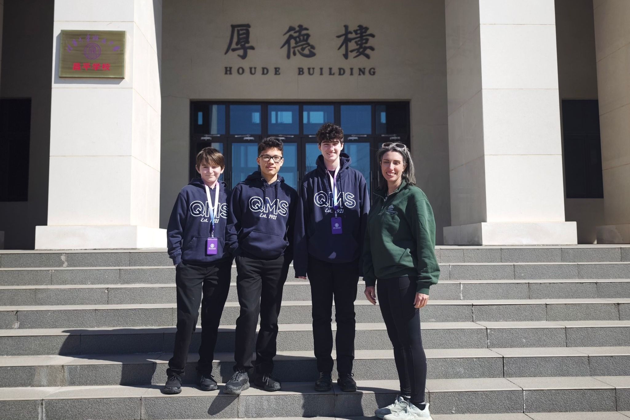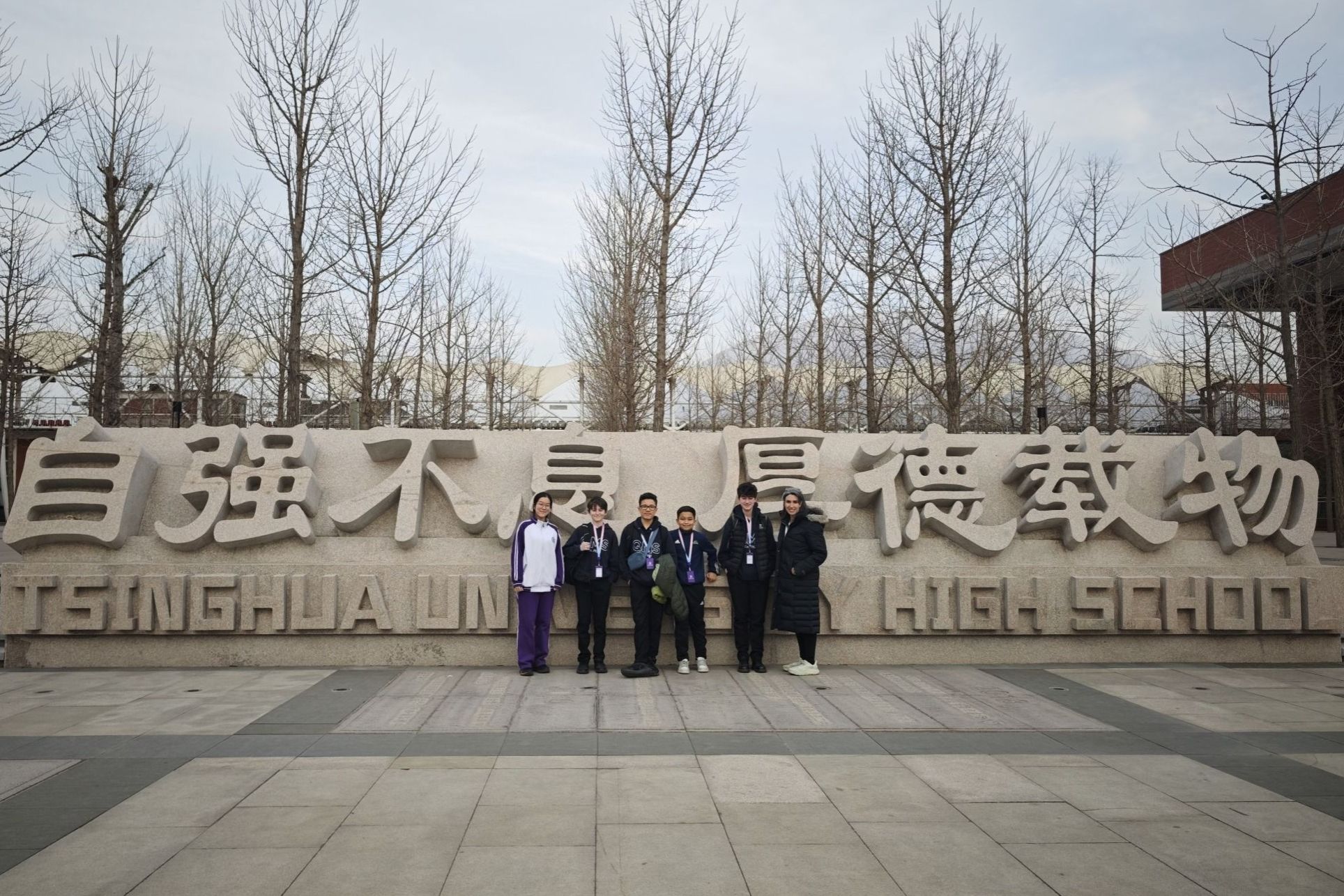 中加师生在清华大学苏世民书院与工作人员(右一梁子悠)合影