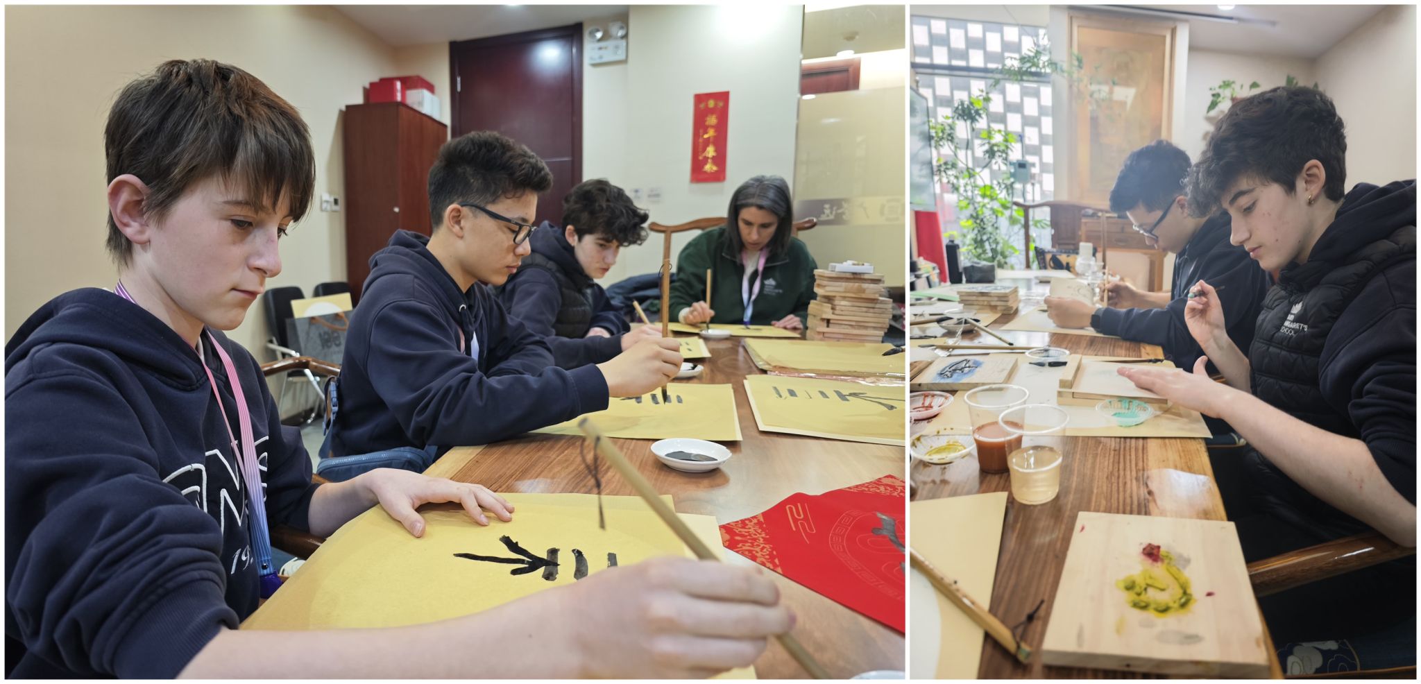 加拿大师生学写毛笔字、制作版画