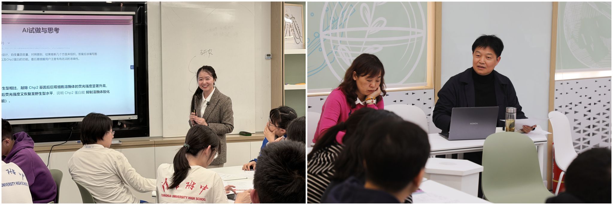 傅舒舒“从命题到解题的探索——AI赋能逆向解题”、昌平一中生物教研组长周有祥老师(右一)作听评课指导