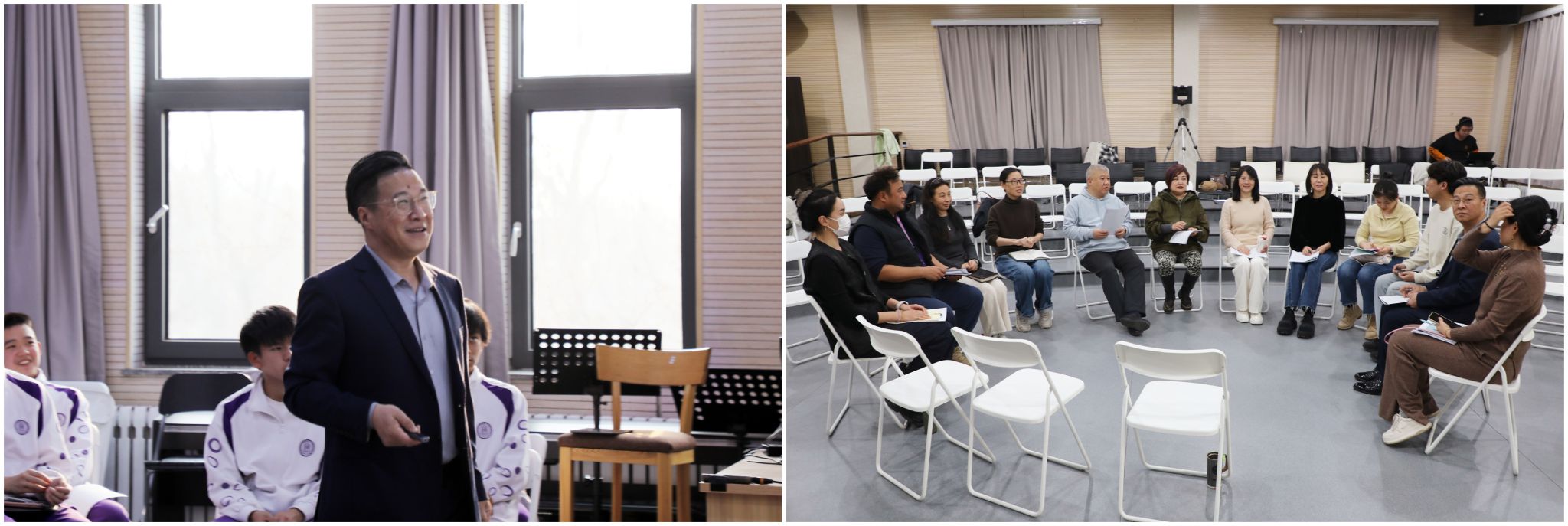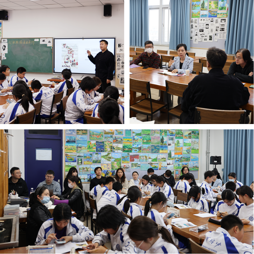 赵滋“版画的创作——人机协同赋能版画创作”、北京市101中学美术正高级教师陈默老师(左二)点评交流、各学科教师听课