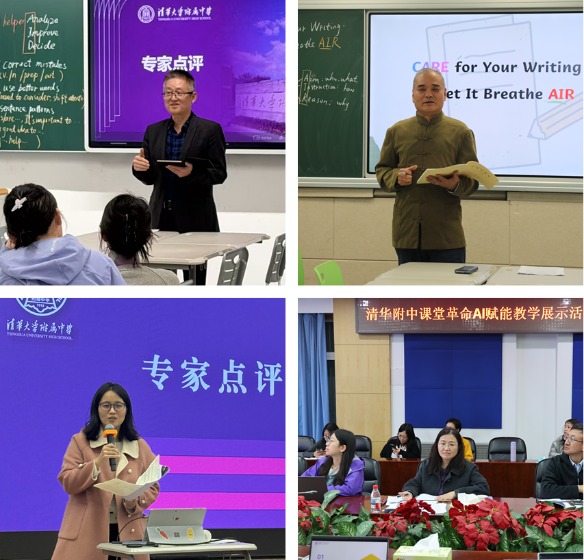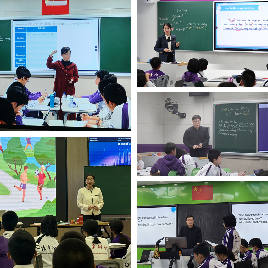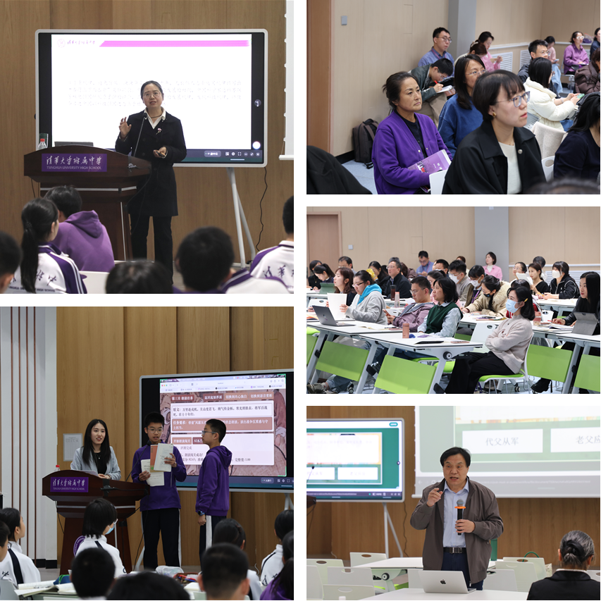 唐中云“择风而趋,不为风役——利用AI助力修改议论文”、从恩竹“木兰的抉择——穿越之北朝巾帼传奇”、澳门网上博彩方妍校长(左二)进班听课、全体语文组教师及参会教师听课、北京师范大学人工智能学院宋继华教授作听评课指导