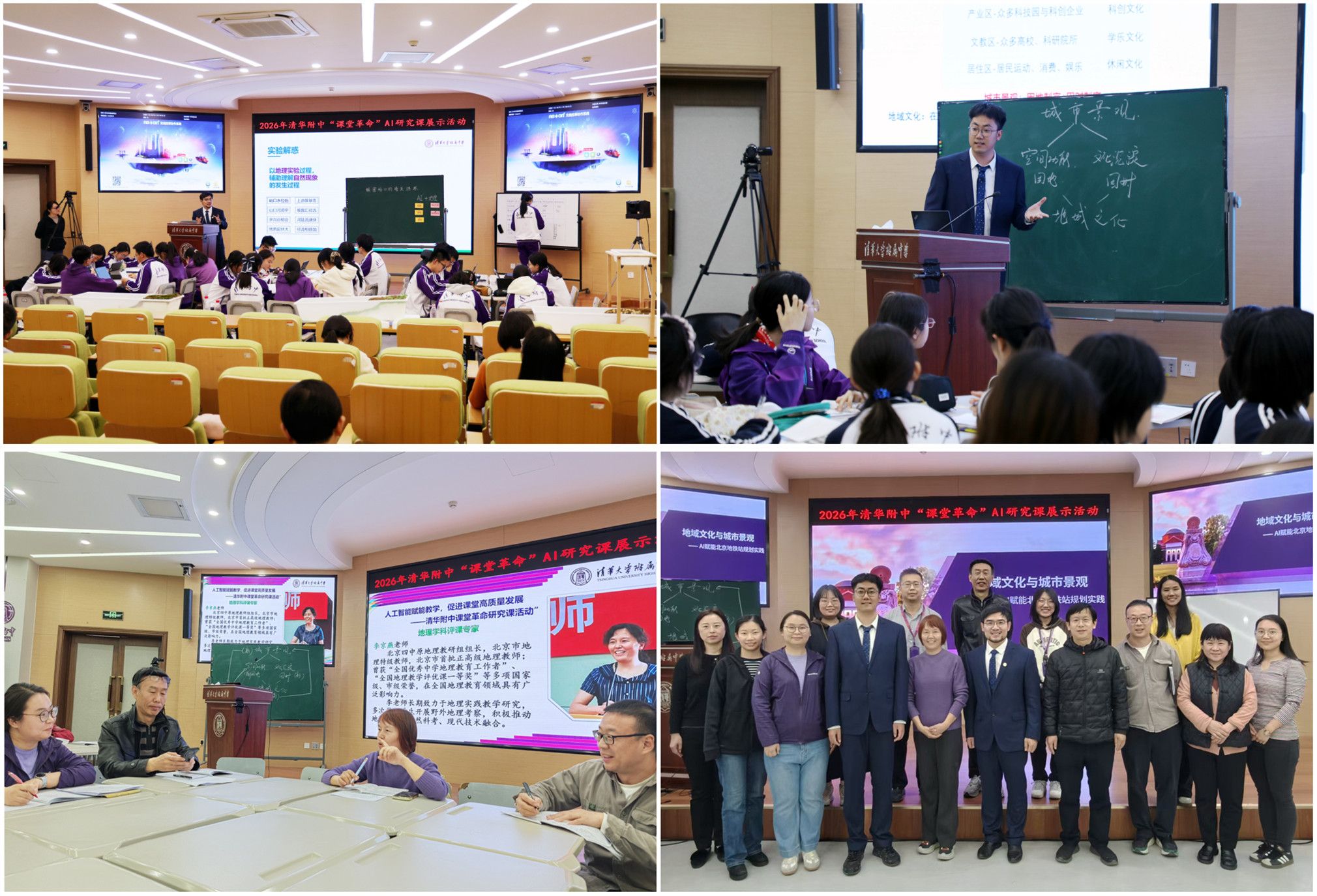 谷丰“解密‘峪口’洪水——AI辅助和地理实践融合下的地形与人类活动关系探究”,宁论辰“地域文化和城市景观”,北京市地理特级教师李京燕老师与地理组教师交流,澳门网上博彩副校长李劲松(第一排右四)、全体地理组教师与听评课专家合影