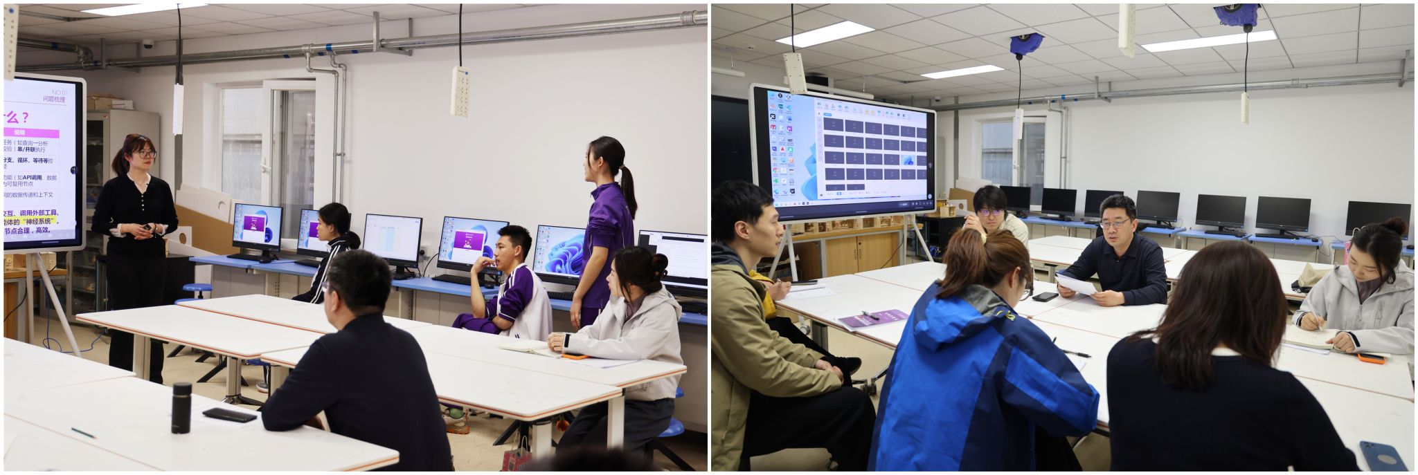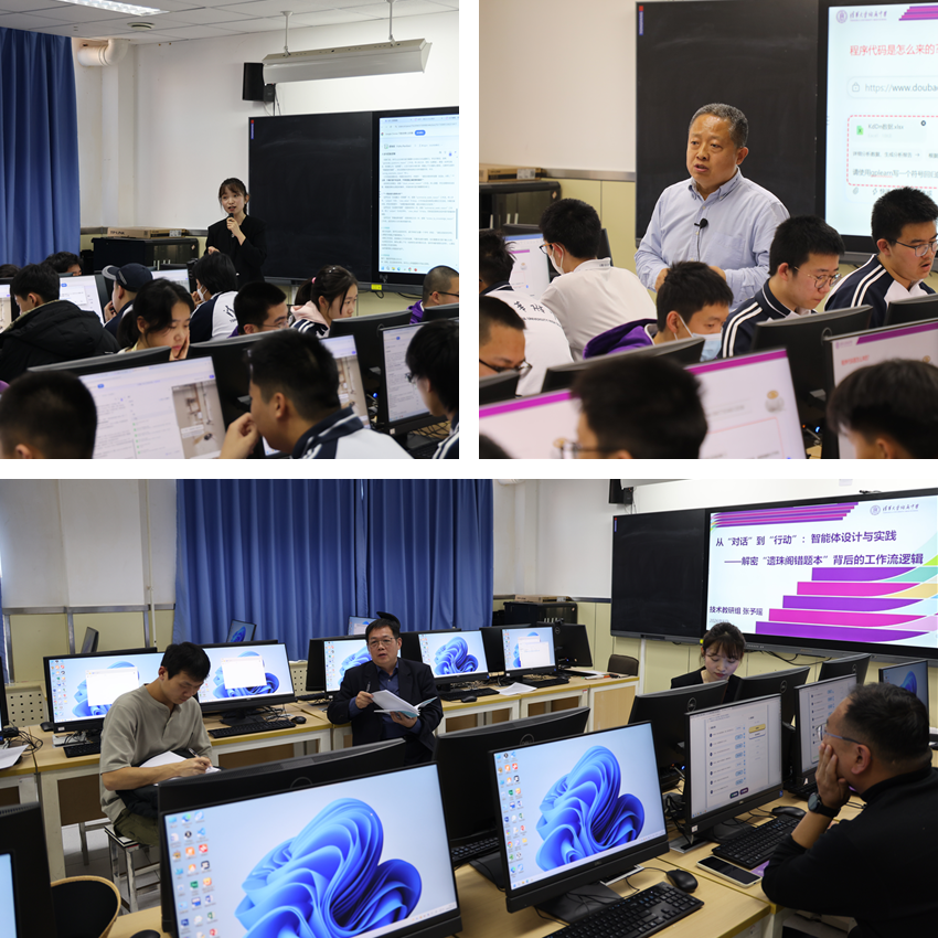 张予瑶“智能体设计与实践——解密‘遗珠阁错题本’背后的工作流逻辑”、孙书明“借助人工智能与机器学习技术探究弹簧刚度系数的参数模型及应用”、朝阳区教师进修学校信息科技教研员王戈老师(左二)作听评课指导