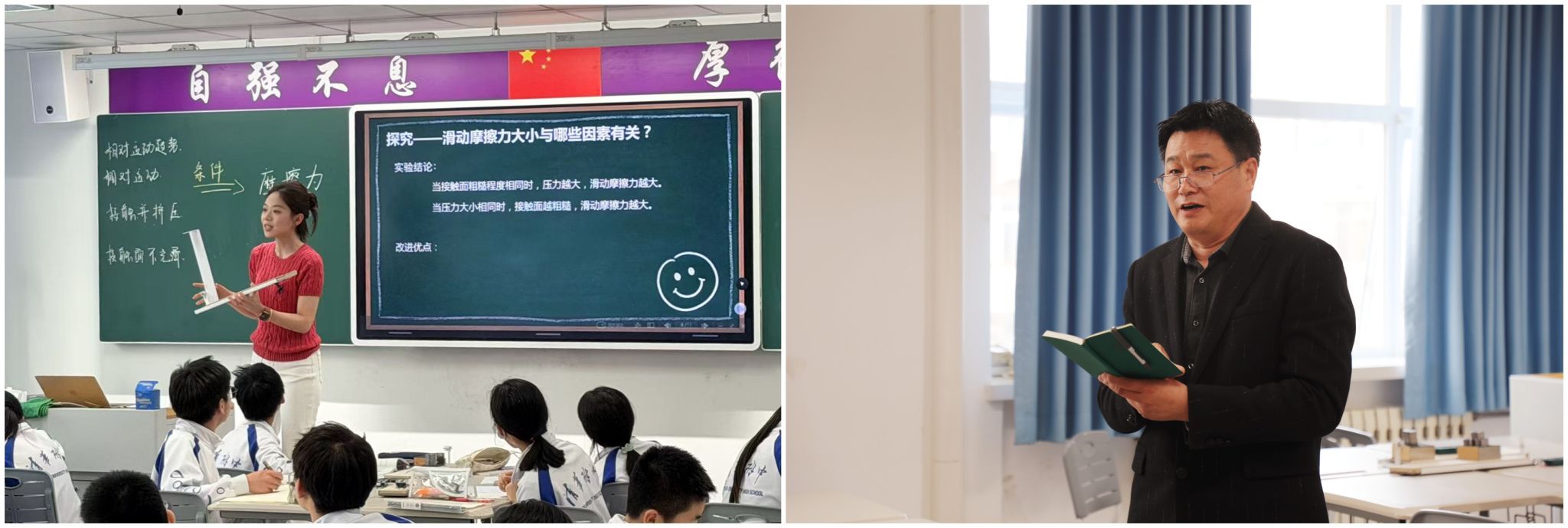 物理组胡译文老师以“玩转黑板擦”探究摩擦力,借助AI讲解概念、处理实验数据,情境化与生活化结合,结构清晰、严谨务实。田成良老师建议进一步强化生活联系与探究设计,提升课堂互动性。
