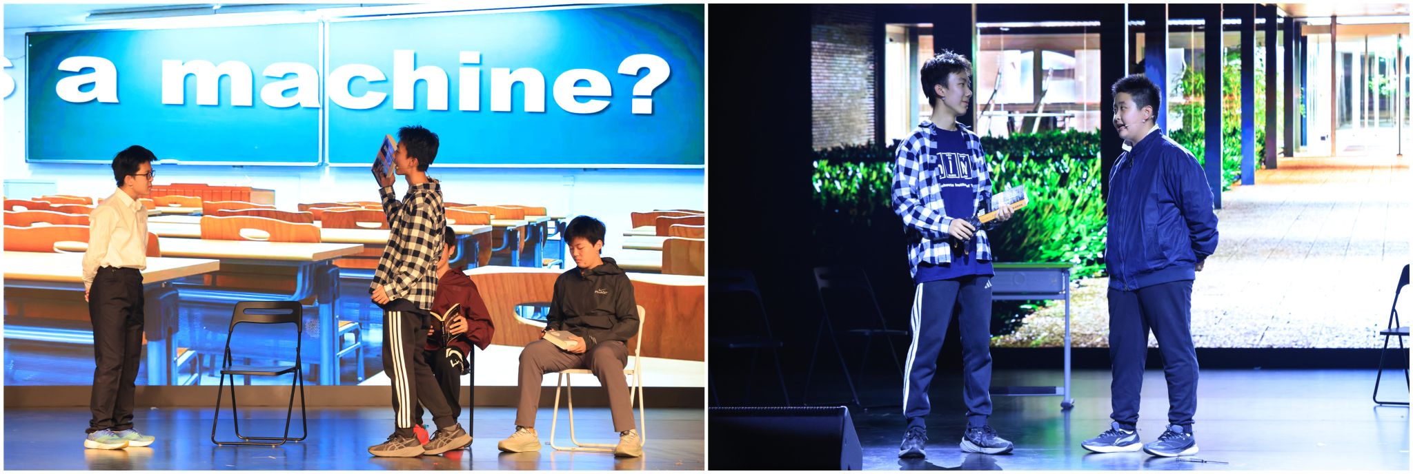 10班与14班的英语短剧《机器之问》聚焦教育与成长。主人公通过挑战填鸭式教育展现少年追求真知、不惧束缚的态度。
