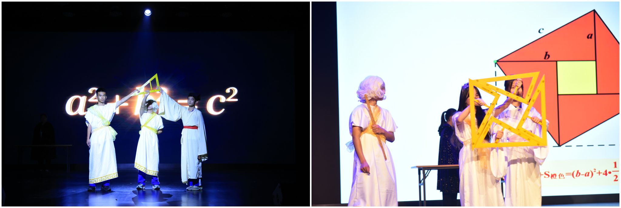 8班与13班联袂呈现数学舞台剧《勾股天音》,以穿越时空为创意,让古今数学家齐聚“数学法庭”。围绕勾股定理展开真理探寻,将先贤的数学智慧搬上舞台,生动展现了数学定理的永恒魅力和对真理的不懈追求。