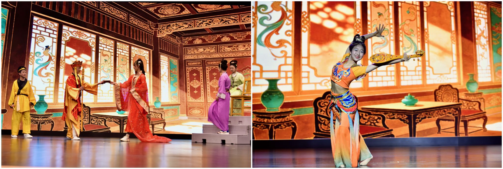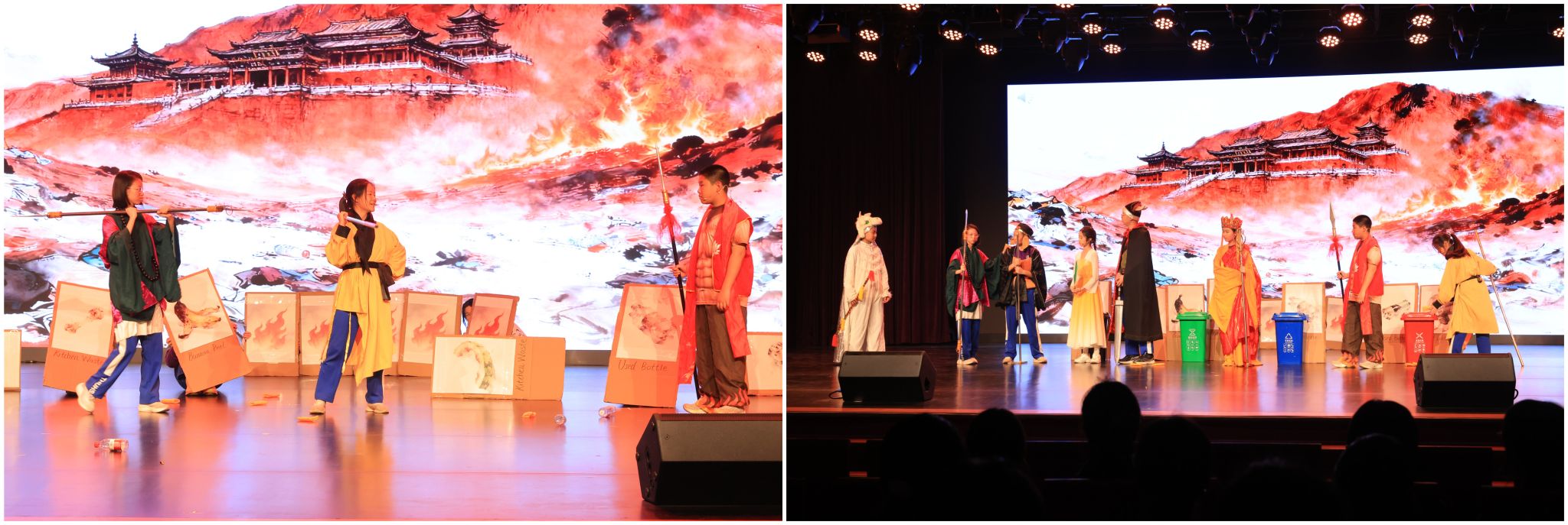 2班的英语短剧《<西游记>之“火焰山环保行动”》则将环保理念融入经典剧情。火焰山因垃圾遍地自燃而成,铁扇公主一家人治理垃圾力不从心。师徒四人了解情况后放弃急行,留下携手治理,让火焰山重归绿水青山。同学们在演绎中传递环保初心。