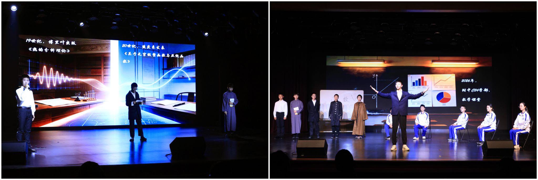 16班和17班的《函光溯源》讲述函数的诞生与传承。从笛卡尔创立解析几何,到傅立叶、熊庆来接力探索,再到数学走进课堂,清晰梳理知识传承脉络,让观众看见数学跨越千年的薪火相传之力。