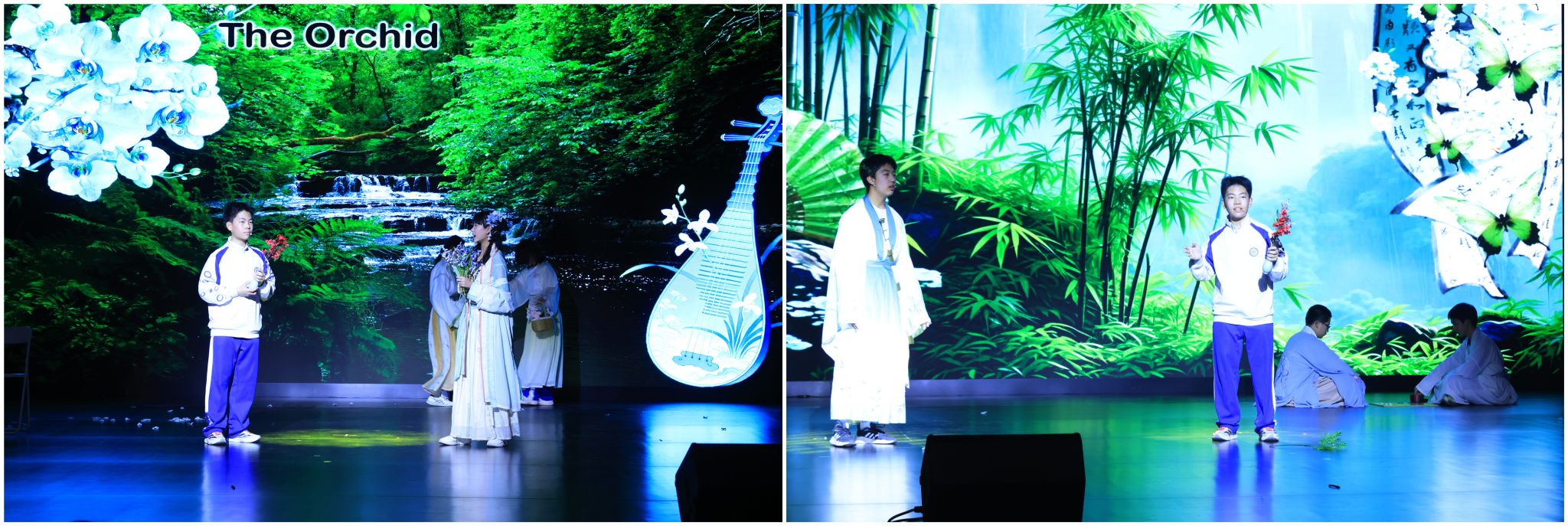 15班的原创英语短剧《寻花问道》,以澳门网上博彩少年穿越时空为主线,与梅兰竹菊精神化身对话,细腻诠释四君子的高洁品格。同学们的演出台词精妙,以花为媒连接传统与现代,在诗意表演中歌颂崇高美好的品德,浸润观众心灵。