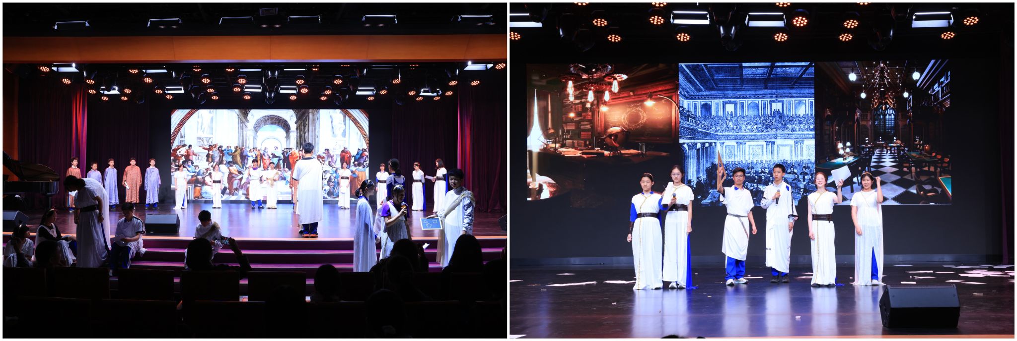11班原创数学短剧《边外之音》,以《雅典学院》为线索讲无理数探索史。希帕索斯发现无理数引发学院争论,剧目同时融入东方成果,展现《九章算术》中对无理数的记载,清晰梳理其从谬论到广为人知的发展脉络。