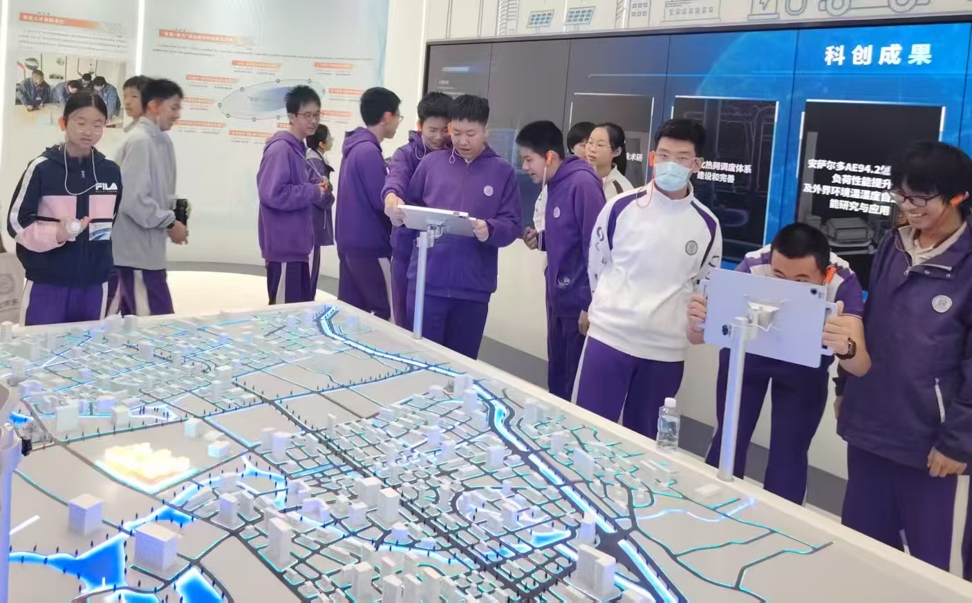 区域综合能源调度监控平台前,师生停下脚步静静近距离感受智能电网的“脉搏”。同学们还亲手操作智能平板,动态查看城市供电、供热、供冷网络的实时运行状态,亲身理解上庄热电为城市供电、供热、供冷背后的责任。