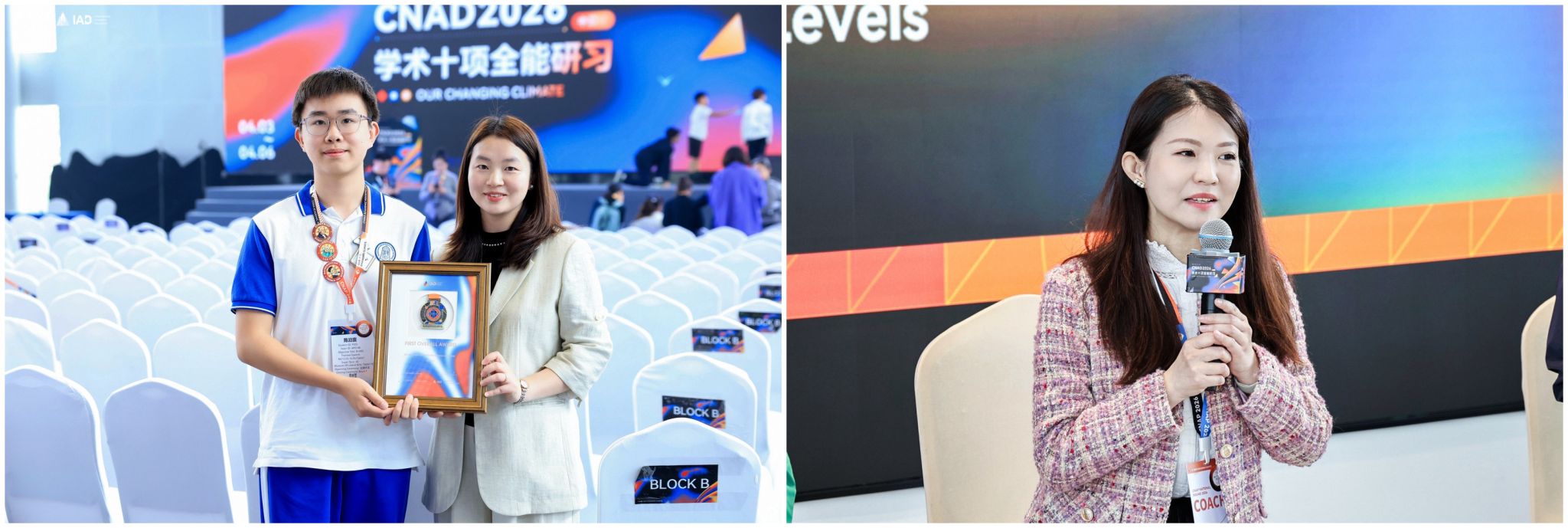 蒋中蓝老师与全国总分金奖获得者陈泊寰同学合影,吴雪婧老师在全国教练论坛作带队经验分享