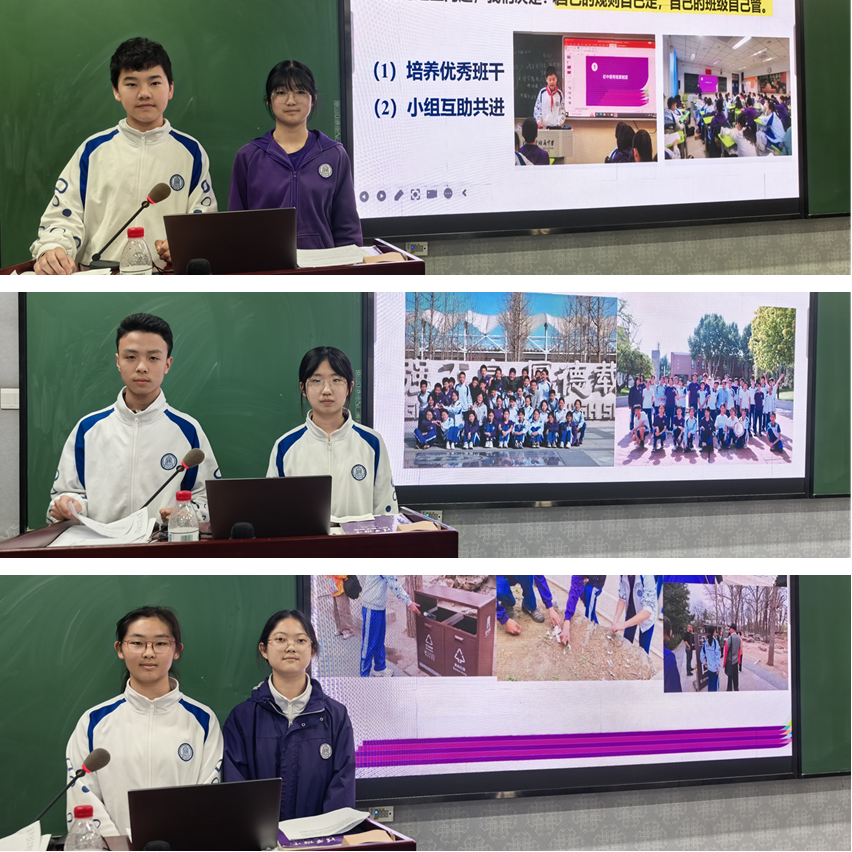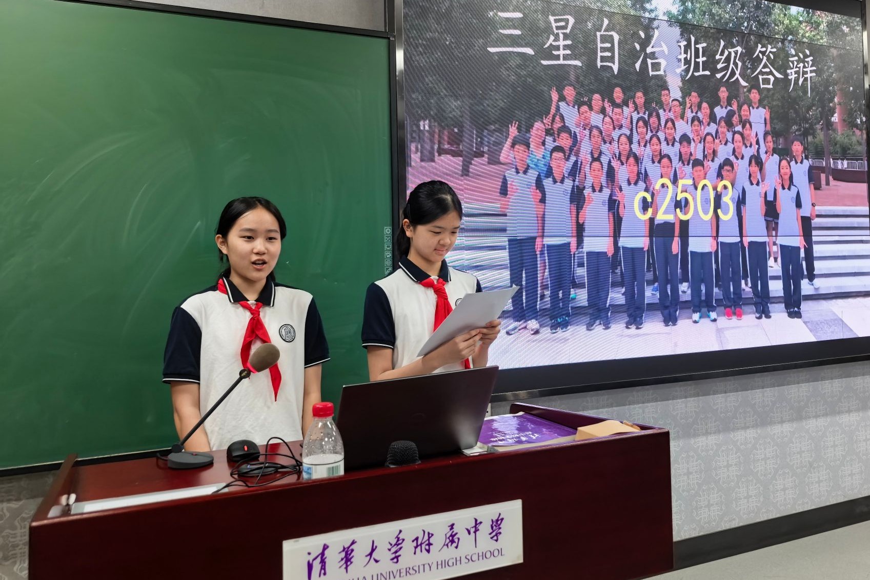 初2409班代表刑天一、程子川进行三星自治星级班级答辩,初2405班代表燕景熙、马浩越进行三星自治星级班级答辩,初2406班代表任翃瑶、邓牧卿进行四星自治星级班级答辩