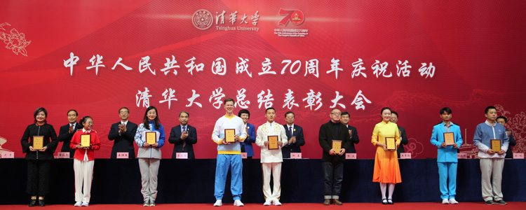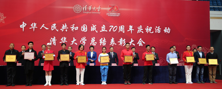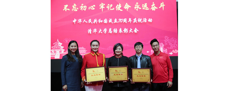 赵茜、李劲松、王金峰老师(右3至右5)上台领取“庆祝中华人民共和国成立70周年活动清华大学先进集体”奖牌