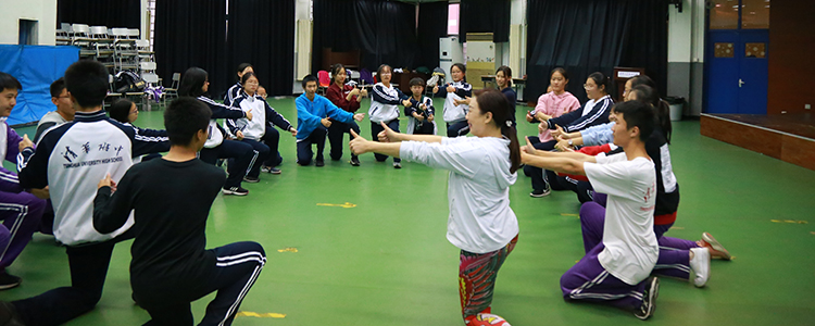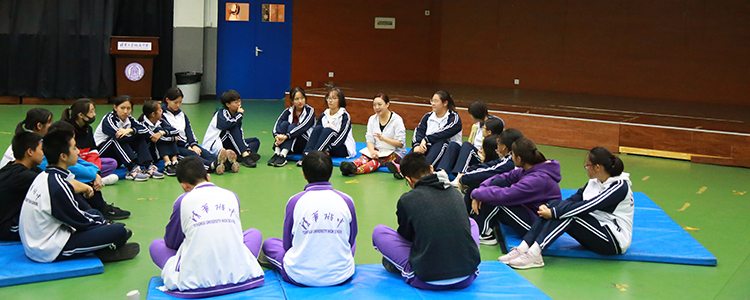 在这节体验课上,没有严肃沉闷的氛围,没有听课用的桌椅和讲堂。周玟汐老师和同学们一起席地而坐,用最舒适放松的方式授课,也让同学们在最轻松愉悦的环境中释放自我。老师和学生们围坐在一起,缩短了师生之间的距离。同学们被这种新颖的课堂形式所吸引,认真感受老师生动的语言和动作。