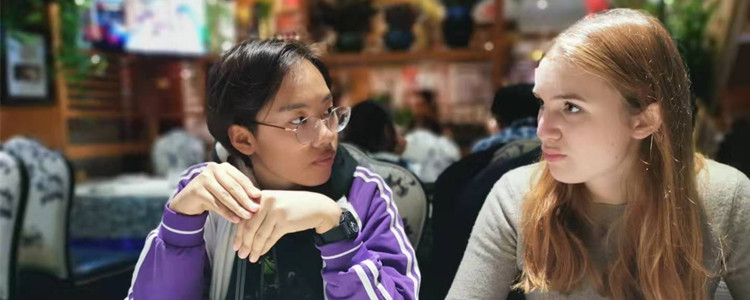 我校学生谢天依和她的伙伴Myrte Falk一同品尝中国美食