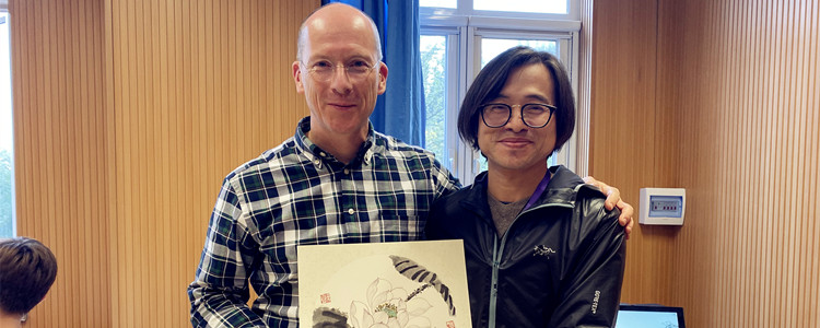 李红星老师合影(右)将自己的作品赠送给德方校长Bernd Westermeyer(左)