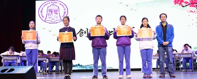 第五项是同学们最期待的“诗词飞花令”活动,14位选手在台上各展其才,台下掌声不断。接着进行全年级第三次现场抽号。第六项是现场比赛颁奖环节,由语文组老师们分别为获奖者颁奖。最后全体同学起立,齐诵岳飞《满江红》,语调铿锵,气势磅礴,将全场氛围推向高潮。语文组老师们还为特等奖获得者精心策划了彩蛋环节,获奖者拥有“砸金蛋”的权利,并有机会获得语文组独家定制的精美奖品。