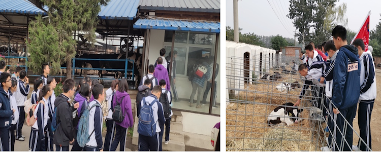 在劳动间隙,基地老师先后带领不同班级的同学们参观了寒春、阳早两位为我国奶牛品质改良和奶牛饲养机械化事业做出了突出贡献的美国友人的故居。他们因信仰共产国际,不远万里从美国来到中国,在1949年带着党交给的任务,赶着83头荷兰奶牛来到荒凉偏僻的三边地区建立牧场,帮助当地牧民改良牛羊;之后的几十年,他们不断通过技术革新,在中国率先实现了奶牛饲养机械化,立志让贫困的中国人喝上新鲜牛奶。他们自称“在中国养了一辈子的牛”,被称为 “中国人民的好朋友”、“国际友人”。随后,基地老师又带领同学们参观了牛场,零距离接触了现代化农场,并了解其先进的运作模式。