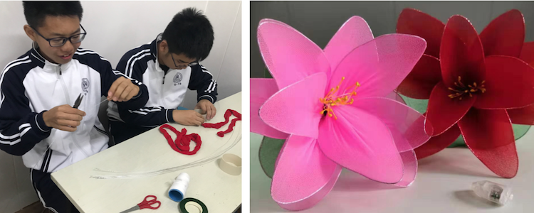 在制作花灯环节,首先基地老师带领大家猜灯谜,教授花灯的种类以及制作流程;在实际操作环节,老师指导同学们先将铁丝缠成铁圈,再将丝网套上去并进行固定制作成花瓣,然后将各花瓣与花蕊组合起来,最后制出叶片,将叶片与花朵连接到一起。