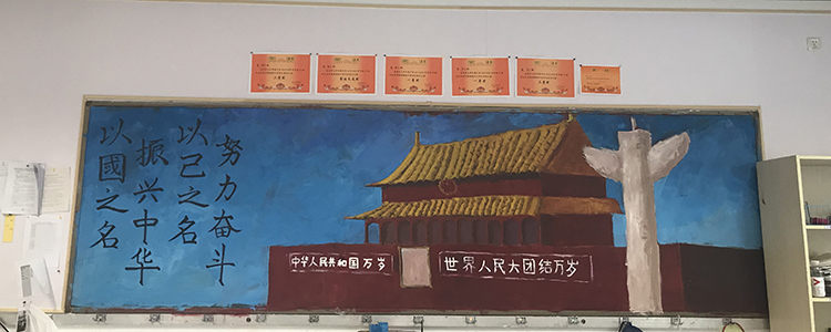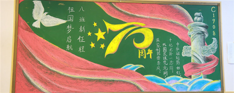 为热烈庆祝新中国成立70周年,9月校团委组织全校各班开展“班级空间文化评比”活动,其中包括“峥嵘七十载,逐梦新时代”主题黑板报设计,要求各班后黑板板报内容要以“我和我的祖国”、“峥嵘七十载,逐梦新时代”、“我为祖国点赞”等突出国庆热烈氛围的主题展开设计。经过一个月的筹备和设计,初高中各班都完成了板报绘制工作。