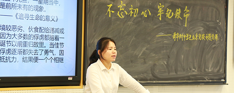 魏园园老师以《为什么我的眼里常含泪水,因为我对这土地爱得深沉》为题,在短短四十分钟的时间里,她从自己的亲身经历讲起,由浅及深地剖析了“初心”和“使命”对于当代中学生以及中国共产党员的意义。回看自己一路走来的经历,魏老师的初心从个人及家庭,上升到社会、国家乃至民族的发展。“如果我们懂得为什么而活,生活中的一切磨难便都可以忍受 ”,魏老师引用《追寻生命的意义》中的话强调怀揣梦想的重要意义。她告诉同学们由设立一个可堪期待的目标开始努力,不满足于已有成就、不屈服于暂时困难,为心中的梦想不懈奋斗,这便是青年一辈的初心与使命。