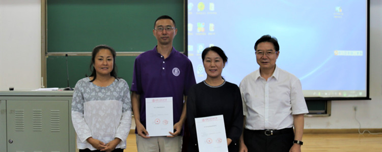 颁发干部任命书合影照片(左起:党委书记方妍、学生发展中心主任王田、国际部执行校长李文平、校长王殿军)
