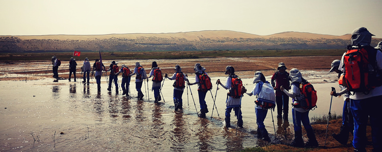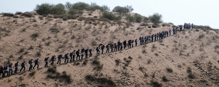 同学们排成一队穿越沙山