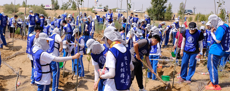 7月10日清晨,全体师生来到了银肯塔拉沙漠植树基地,在这里师生种下了近300棵杨树,为祖国的西部生态改善贡献自己的一份力量,也种下一片希望。