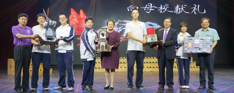 在高考结束后,高16级30多名同学主动请缨,日夜兼程,在谭洪政老师的带领下,精心设计并制作了五份礼物,包括代表化梦为蝶的机械手臂、会唱校歌的附中八音盒、一个3D打印的附中微缩景观、一个以附中为背景的创意游戏以及一份涂鸦。王殿军校长、方妍书记、解巨钊副校长、白雪峰副校长代表学校上台接受这些满怀高16学生爱意的礼物。