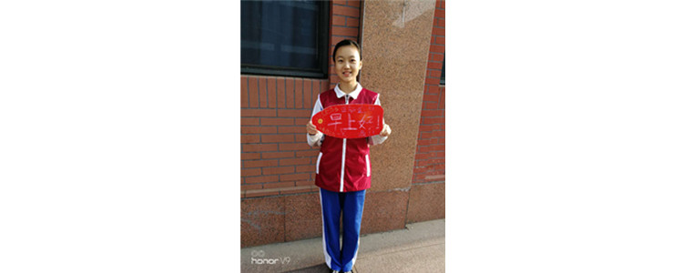 张梦琦同学在校门口带着自制的环保问候卡值周