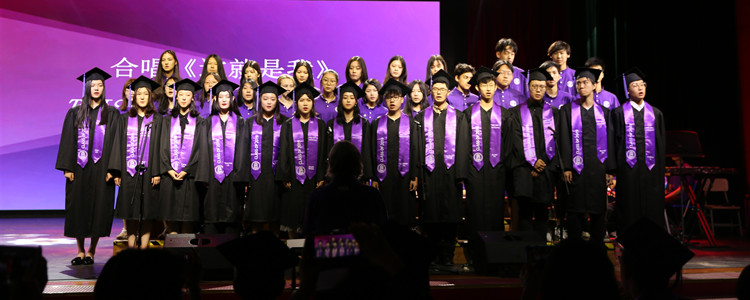 之后,毕业生们身着学士服,在国际部乐队的毕业颂歌的伴奏下依次入场。迎接他们的是来自于校领导、教师、家长和同学们经久不息的热烈掌声。