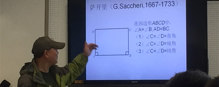 随后,王教授介绍了欧几里得的第五平行公设在数学史上的非凡地位。两千多年来,无数数学家都对其进行过研究。人们证明了很多命题与之等价,其中就有大家都熟悉的命题“三角形内角和等于180度”,但从其它4条公设证明第五公设的所有尝试都失败了。