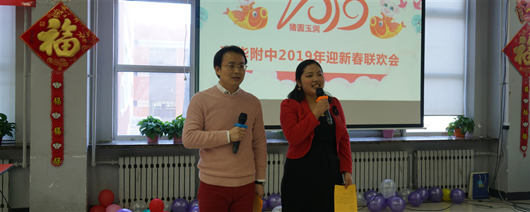 在喜庆祥和的音乐声中,主持人向东佳、王诗琦老师宣布联欢开始。工会委员们首先给大家送出了“诸事顺利”“珠玉满堂”的吉祥祝语,接着,王殿军校长致新春贺词,王校长感谢广大教职工在2018年的付出,并向全体教职工及其家人致以深切的问候与祝福。稍后的环节里,附中全体校领导还为正值本命年的教职工们赠送吉祥物纪念品。