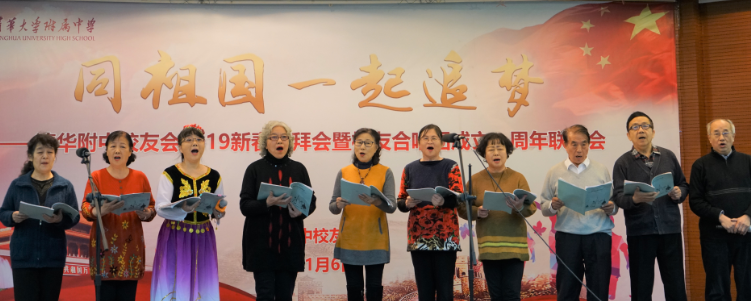 新年联欢会由校友陈耘、刘明明主持,田园艺术团首先为大家带来舞蹈《阿拉木汗》;校友郭东方演唱咏叹调《美好的夜晚多寂静》; 男声小合唱《等待出航》(领唱:王英民 朗诵:沈以力)《啊!朋友再见》(领唱:沈学锋);中国人民解放军陆军文工团于乃久演唱《最美的歌献给妈妈》、《我和我的祖国》;女生小合唱《又见炊烟》;王殿军校长演唱陕北民歌《东方红》;男女生小合唱《海港之夜》、《窗外有棵稠李树在摇晃》(钢琴伴奏:马迅);中国人民解放军陆军文工团贾珍演唱《节日欢歌》;歌伴舞《沂蒙颂》;女生小合唱《相亲相爱一家人》;大合唱《去一个美丽的地方》、《同一首歌》、《共和国之恋》(指挥:许愿、钢琴伴奏:郑惠玲)。校友们用优美的歌声和舞蹈一起喜迎新春,祝福2019!