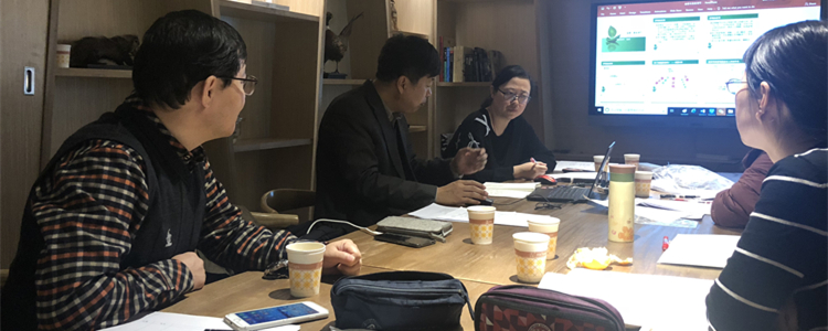 北京教育科学研究院乔文军(左二)、海淀区教研员柳忠烈(左一)与四位老师磨课