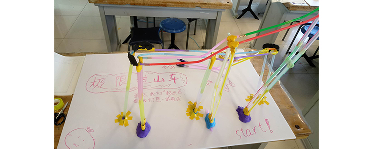 在本次招新活动中,举办了一个小小的竞赛环节,利用简单的吸管、彩泥、胶带、剪刀等材料工具,分组合作制作一个可以让乒乓球滑下的过山车。同学们各自发挥创意,体会到了创意和设计的乐趣,也逐渐了解到了“创客”的含义。