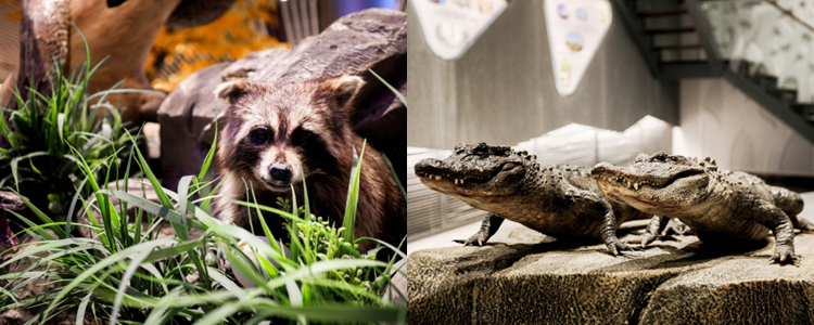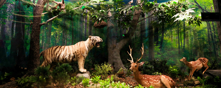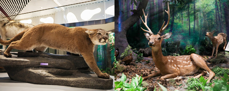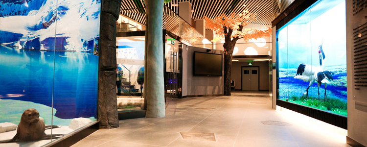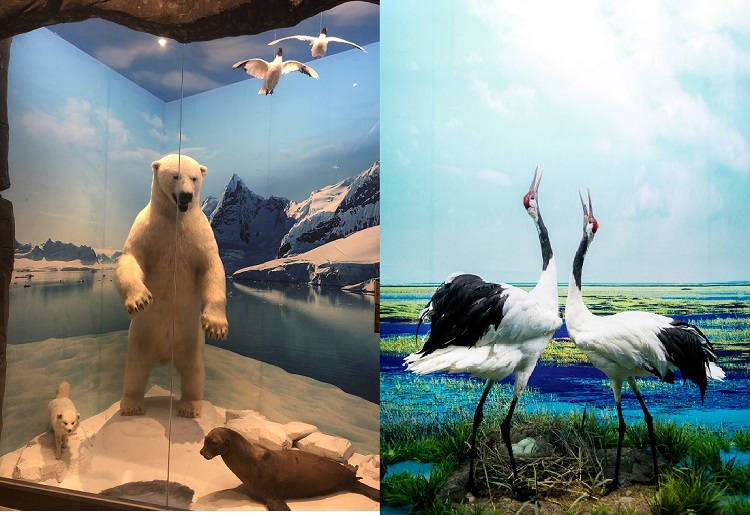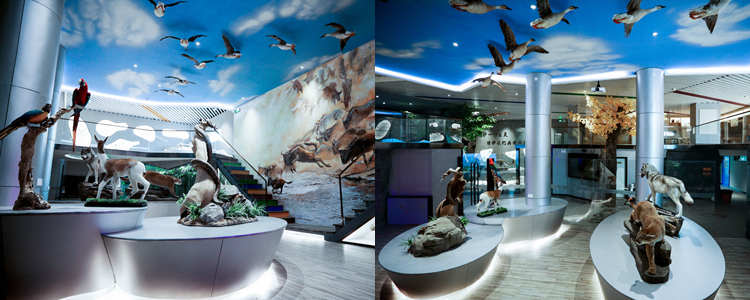 标本馆的陈列方式一改常规的货架式摆,而是将动植物标本陈列于自然的生态环境中。一层展厅设计了森林、海洋、湿地、极地四个生态展窗,并且按照地理区域将非洲、美洲、澳洲、亚洲的典型代表动物分成四个展区。左侧亚洲展区,陈列着雪豹、朱鹮、金丝猴、扬子鳄等中国的珍稀保护物种;地龛中设计了妙趣横生的小型生态场景;展顶部蓝天白云,有鸿雁列队飞过;大厅正面5米高的主题墙是非洲大草原角马迁徙的壮观场景。小空间、大容量,一千多种生物栩栩如灵动呈现在标本馆中,共筑大自然生命的美妙。