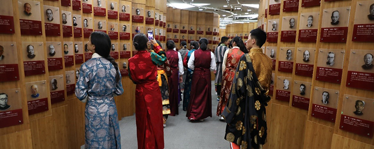 林芝二高的学生在清华大学校史馆“院士墙”前驻足观看
