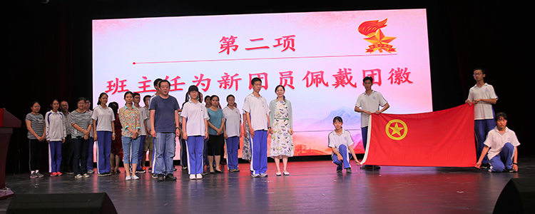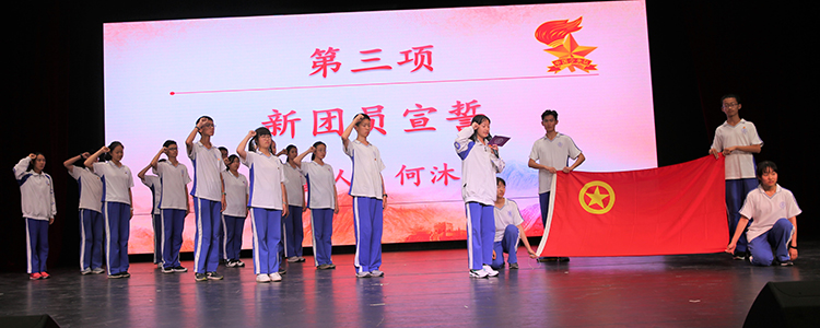 在板块二中,同学们告别少先队,步入属于他们的新时代,成为肩负时代责任和历史使命的新青年。首先由班主任老师为新团员代表佩戴团徽,新老团员在初1612团支部何沐容的带领下庄严宣誓,誓词包含对共青团的景仰和为共产主义事业奋斗终身的决心。在宣誓仪式过后,学生发展中心副主任王田宣布建团决定,特批准初16级品学兼优、各项素质出类拔萃、在学校班级各项活动中表现突出、能真正起到很好的模范带头作用的96名同学加入中国共青团,并在初16级建立1个团总支和14个团支部。
