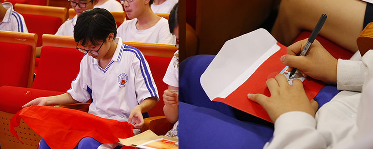 表彰结束后,在大屏幕中播放了各班的成长故事视频,引起在座同学的阵阵欢呼。在队旗的映衬下,在队歌的旋律中,少先大队辅导员赵习老师宣布初16级离队决定。根据《少先队队章》年满14岁的队员,光荣离队,同学们摘下了陪伴自己8年的红领巾,与童年回忆卡一起缓缓放入收藏袋中,对自己的童年正式道一声“再见”。接下来,新团员代表初1614团支部阴子悦带来了成长感言,她回顾了在少先队大家庭的成长经历,从童年到少年的心路历程,以及加入共青团后作为一名团员的自豪感,责任感和使命感,并代表新团员发表了为共产主义事业奋斗终身的宣言。