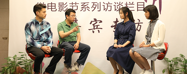 央视少儿频道主持人赵一天(左一)和央视著名主持人阿丘(左二)接受微电影访谈