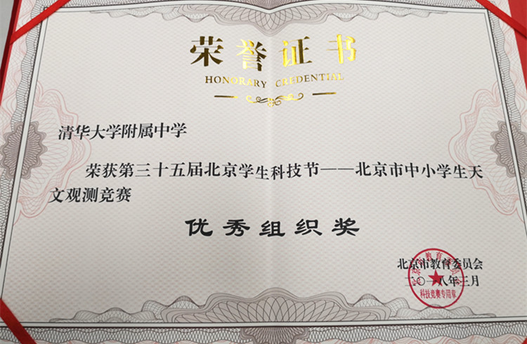 北京市中小学生天文竞赛,是北京市教委面向全市中小学开展的重要的科技竞赛之一。海淀区的初赛是由北京市海淀科普教育协会和北京天文馆共同承办的市区级天文学科比赛。各项竞赛均分为小学组、初中组、高中组三个组别,设置初赛(区)和决赛(市)两个阶段。竞赛分为四个方向:知识、观测、论文、摄影。我校于2017年11月11日,11月18日和12月17日分别参加了初赛,观测决赛和团体知识决赛。
