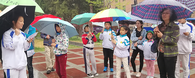 大约四点半,由班级五位同学带领天云中心的师生参观清华大学校园,这是本次微公益的第二项活动。活动过程中,初1502班的马贞元和李念萱同学,为天云中心的孩子们讲述清华大学的历史与文化。绵绵细雨中,孩子们撑伞漫步于清华园,感受清华独特的魅力与意蕴,留下了宝贵的合影。