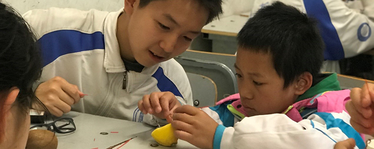 经过两个多小时的车程,天云中心的师生在下午1点半来到澳门博彩在线,2点活动正式开始。初1502班的同学和天云中心的孩子们被分为8个小组,同学们耐心的向天云中心的孩子们讲解“体验电光之美—水果电池制作”和“共享形体之趣—超轻黏土捏制”等科学实验制作的注意事项。随后,他们在班级进行科学实验活动,教室里欢声笑语不断。