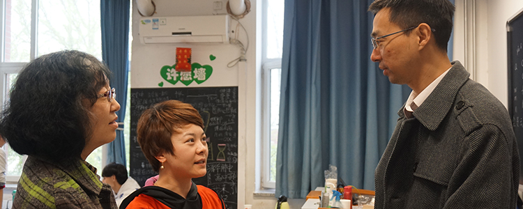 澳门博彩在线王田主任(右1)与天云中心校长、亿天使秘书长全贵云(左1)交谈