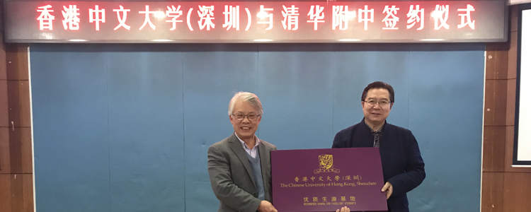 会上,双方签订合作协议并授牌。香港中文大学(深圳)副校长朱世平代表香港中文大学(深圳)向附中授“优质生源基地”匾牌,王殿军校长代表附中接牌。