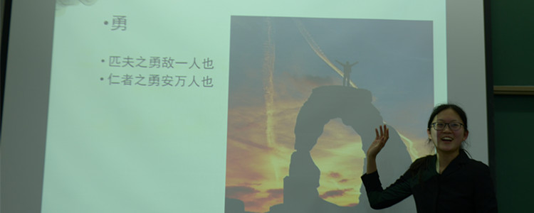 趁着四位评委上台发表感言的间隙,范佳仪、李博文、刘思嘉同学也开始为即兴演讲做起了紧锣密鼓的准备。经过抽签,范佳仪的顺序排在第一个,但却以稳而不乱的端正台风完美的为最终战打响高亢嘹亮的一炮。她抽到的题目是“勇”,重点落在匹夫之勇与仁者之勇的抗衡,是小家还是大家、是个人还是集体,范佳仪同学为这道选择题给出了自己坚定果决的答案。