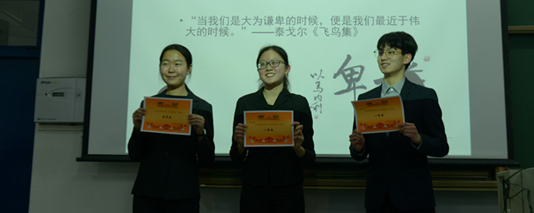 第二位上场的是李博文同学,他的演讲题目为“及时行乐”。常言道,诗酒趁年华,李博文以他幽默自然的演讲风格直击我们生活中发生的小事,明确提出身为新一代青年人的我们应当如何及时行乐、何时行乐。压轴出场的则是刘思嘉同学,她用朴实生动的语言为我们诠释了“谦卑”这词的意义所在。谦卑是淌在中华民族血液里的传统美德,她的演讲,把聆听着的数十位同学带入她表述的意境,从细枝末节感受名师大家的谦卑,感受美德与礼节的熏陶。