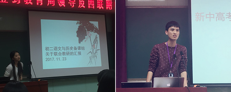 历史组段维维老师做汇报(左图) 语文组林加老师在做汇报(右图)